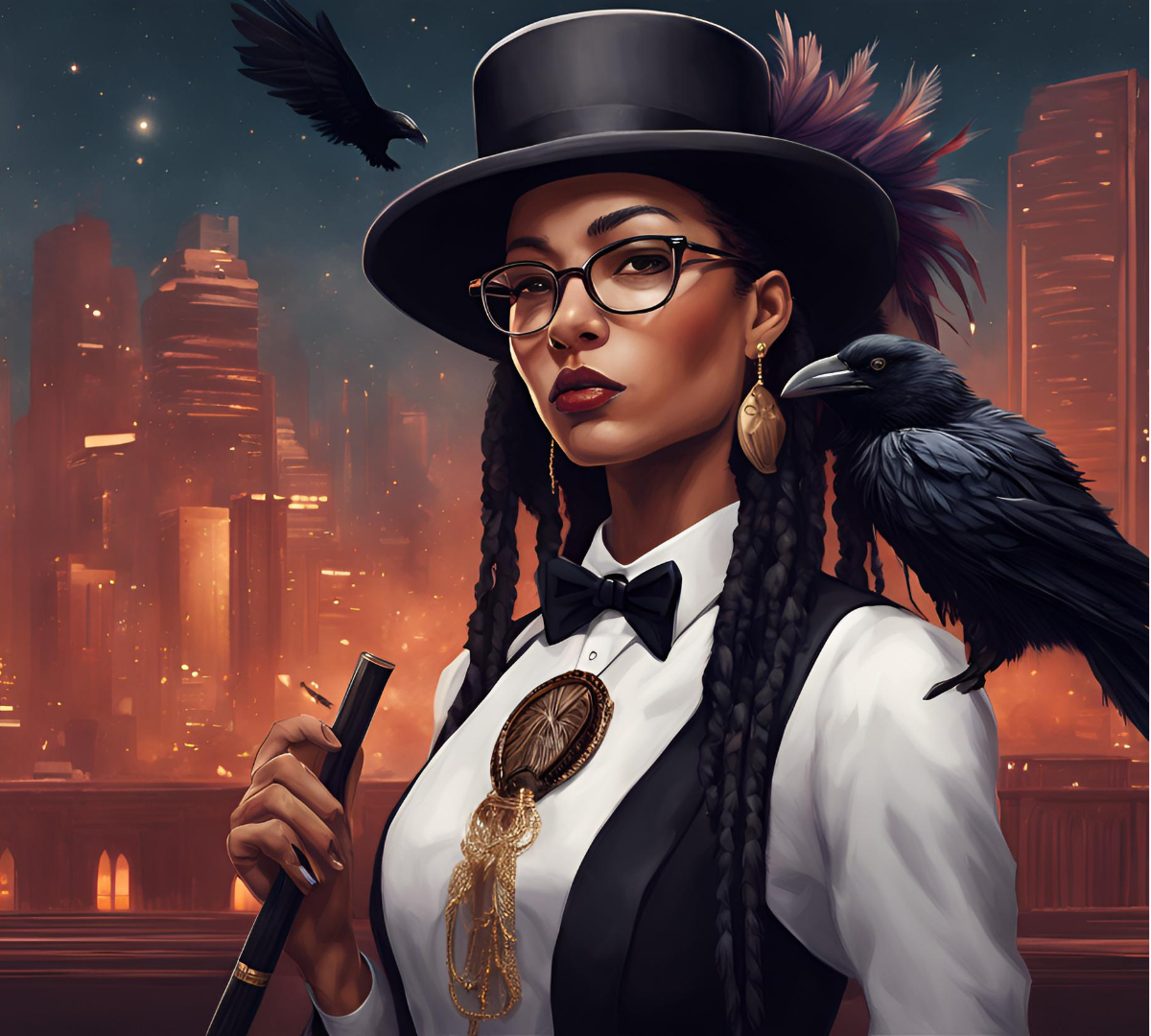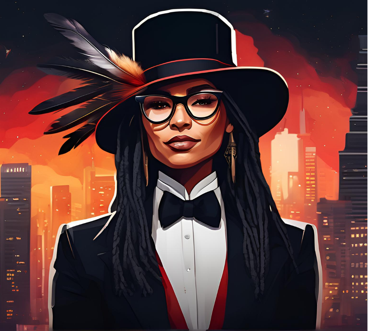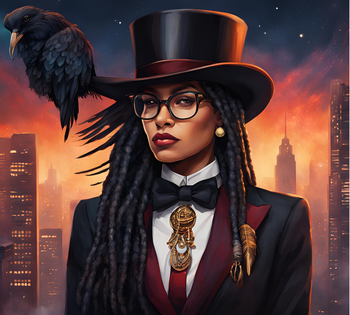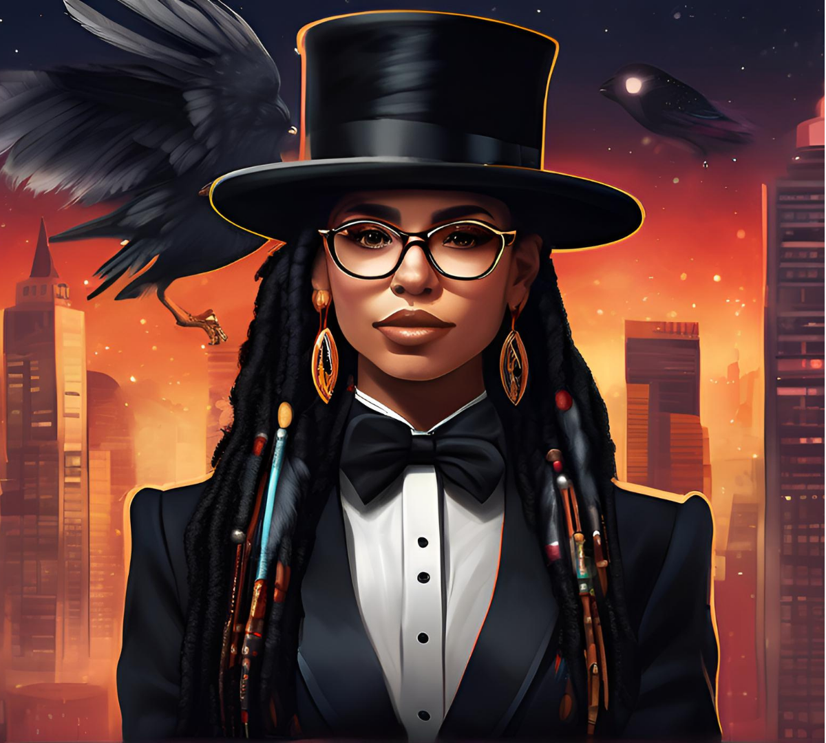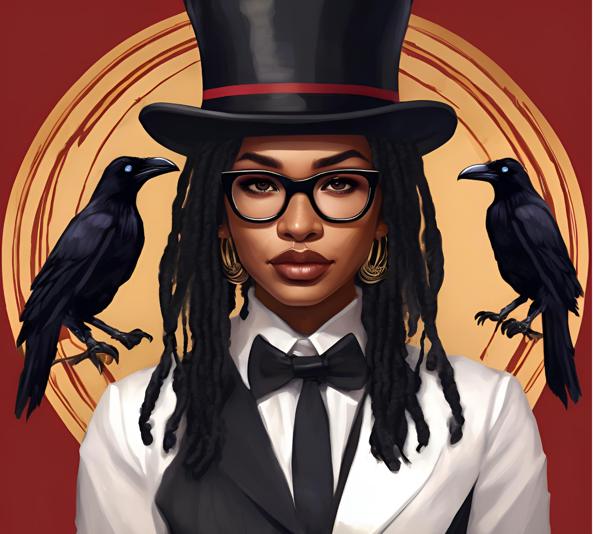 The brand mascot for The Cultured Scholar Communications is Cat Magnus the Propagandist. A Black and Native American young woman with indigenous accessories, a top hate with a red band, glasses, locs, with ravens as her spirit animal.